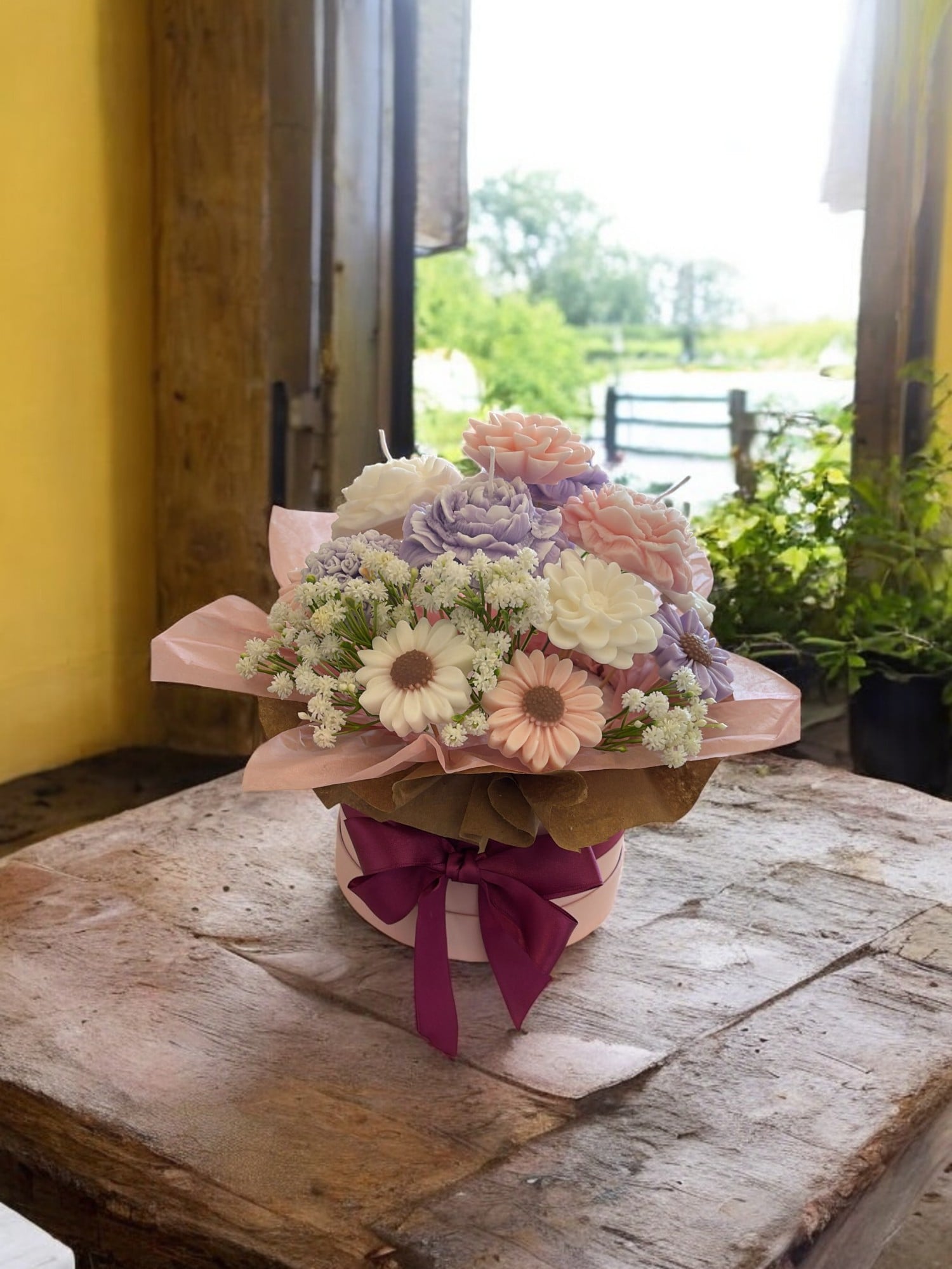 Pastel tonlarında şakayık, papatya ve zambak çiçek figürlerinden oluşan el yapımı doğal mum buketi. Sevgililer Günü için zarif ve romantik bir hediye seçeneği.