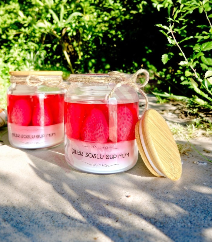 1 adet Çilekli Sos Temalı Kapaklı Cam Kase Soyawax & Jel Mum