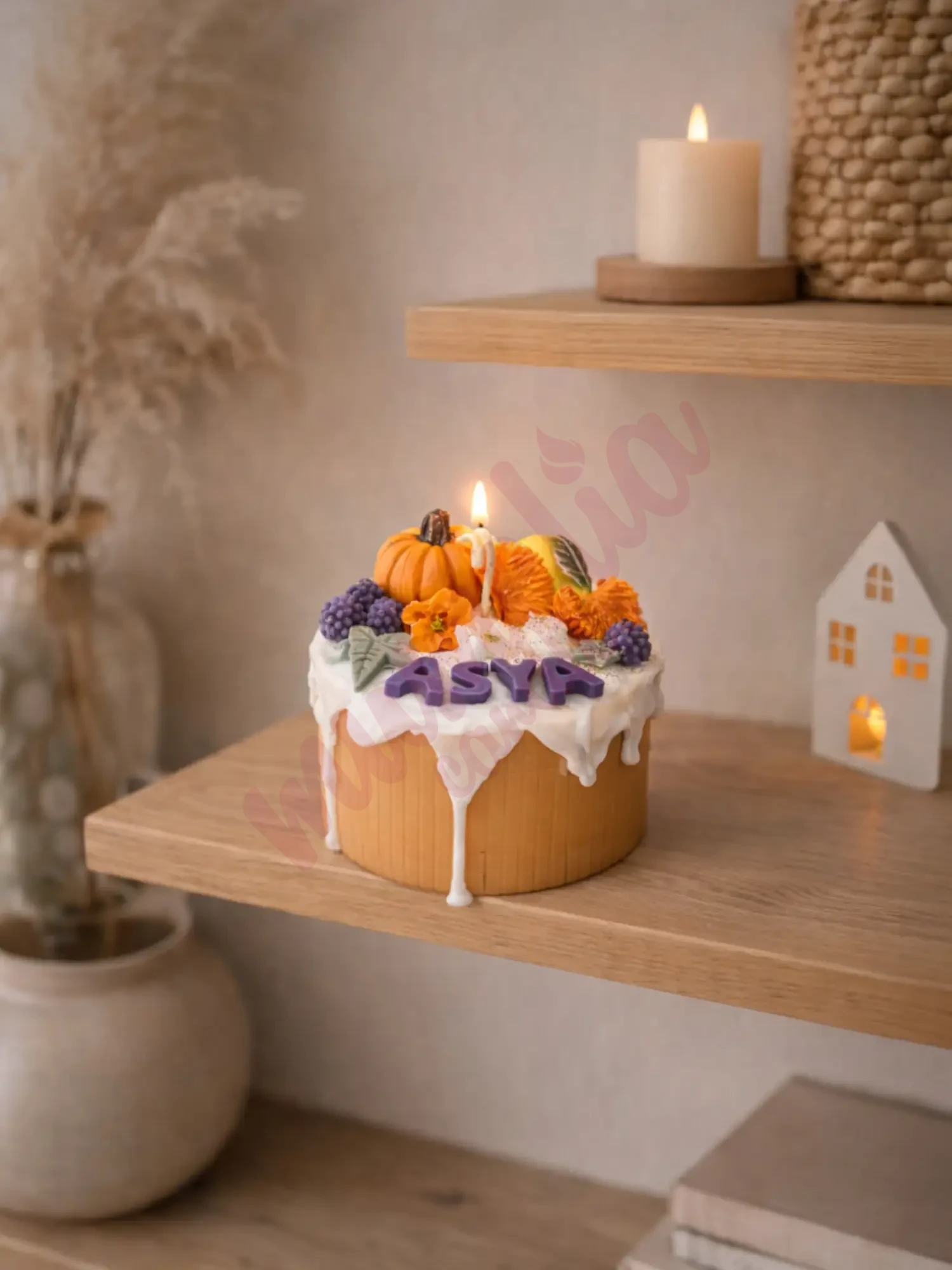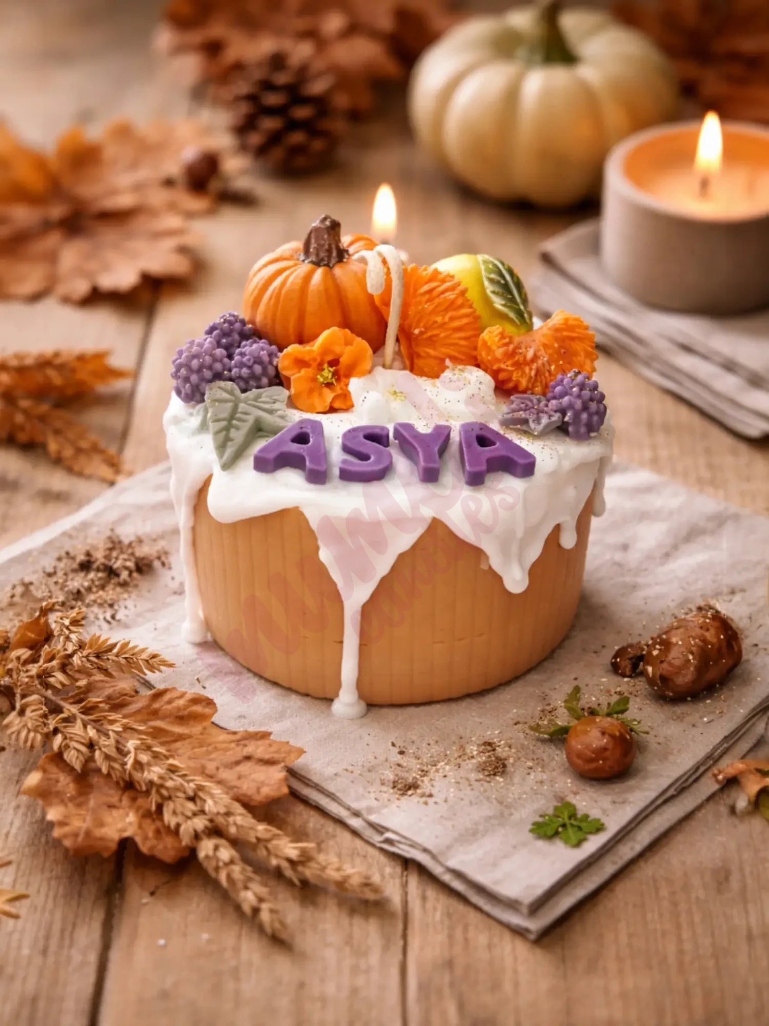 El yapımı doğal soya mumundan üretilen Doğum Günü Pastası Sonbahar Temalı - Doğal SoyaWax Mum, ortamınıza hem estetik bir dokunuş hem de huzurlu bir ambiyans kazandırır.